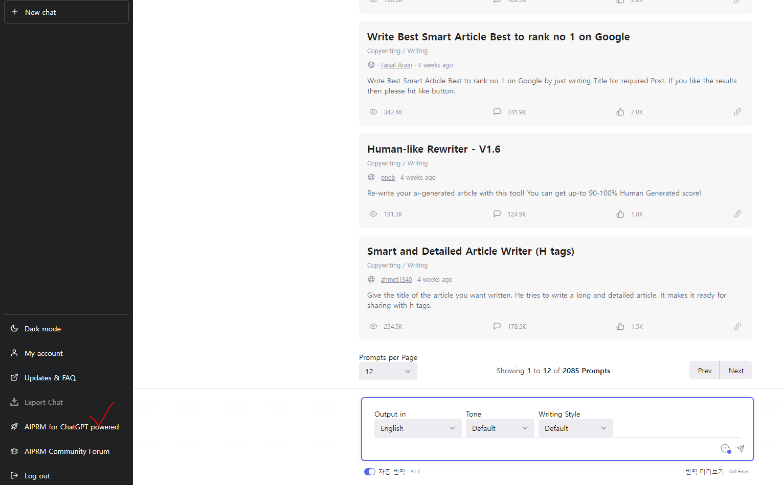 8. 왼쪽하단 "AIPRM for ChatGPT powered"를 클릭하세요.