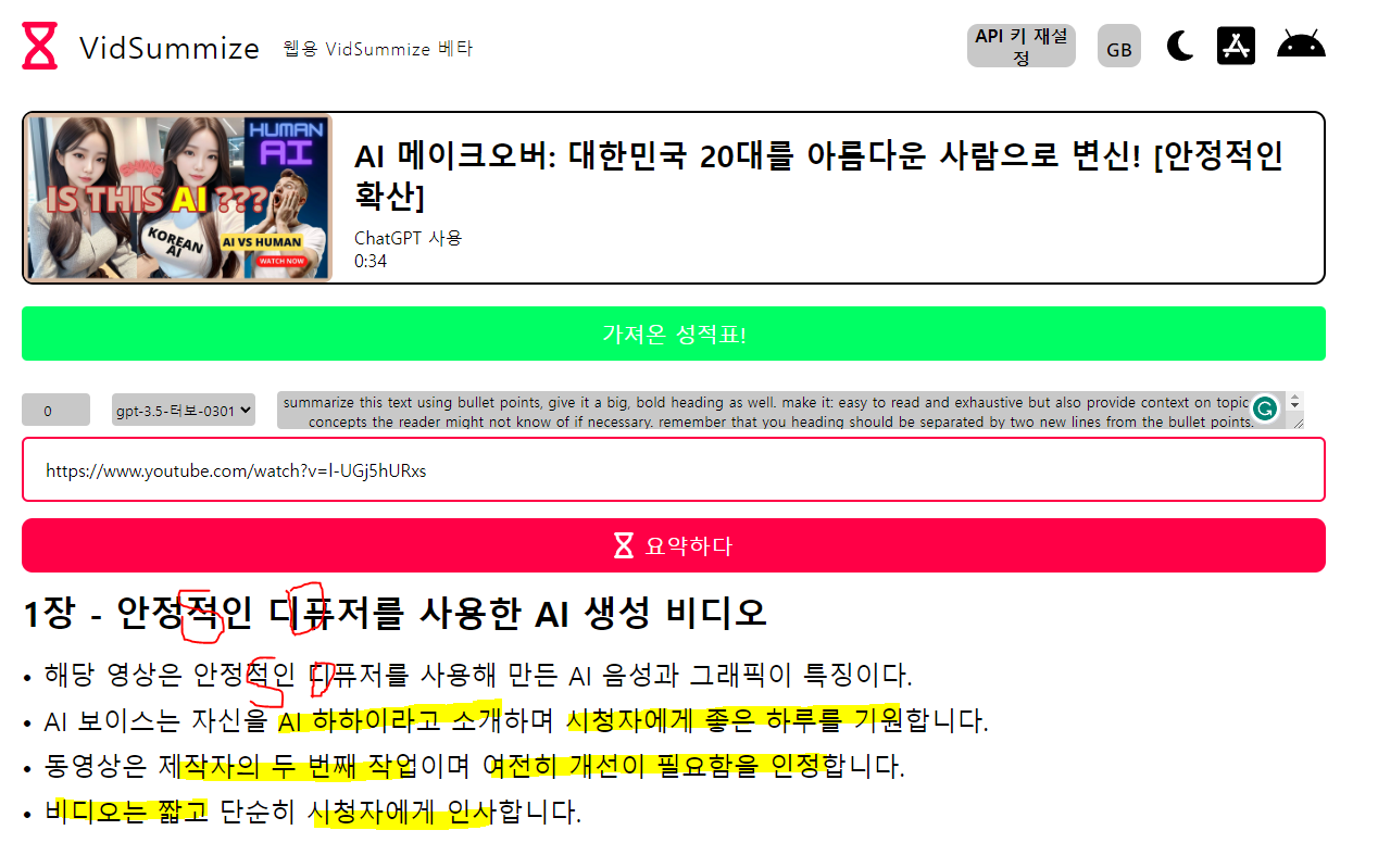 다시  VidSummize 웹사이트 로 가서 붙여넣기를 해봅시다.