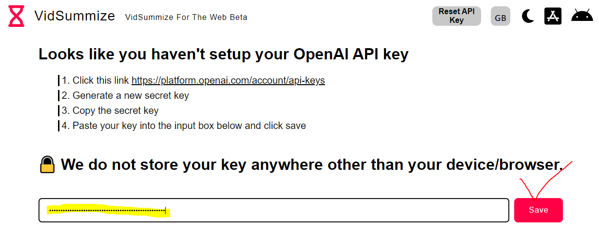 VidSummize는 OpenAI API key와 연결해