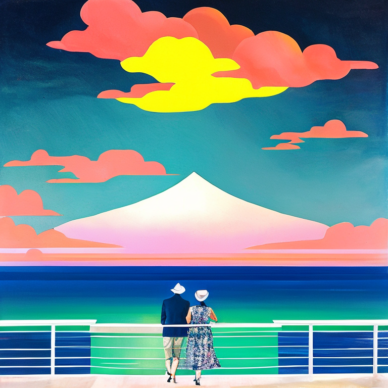 /imagine prompt: You and your husband are on a boat, sailing towards the horizon.